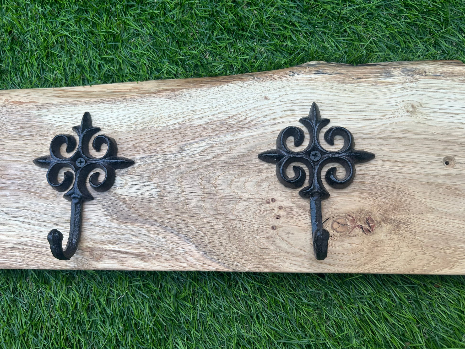 - Beautifully crafted live edge Oak with rustic antique hooks