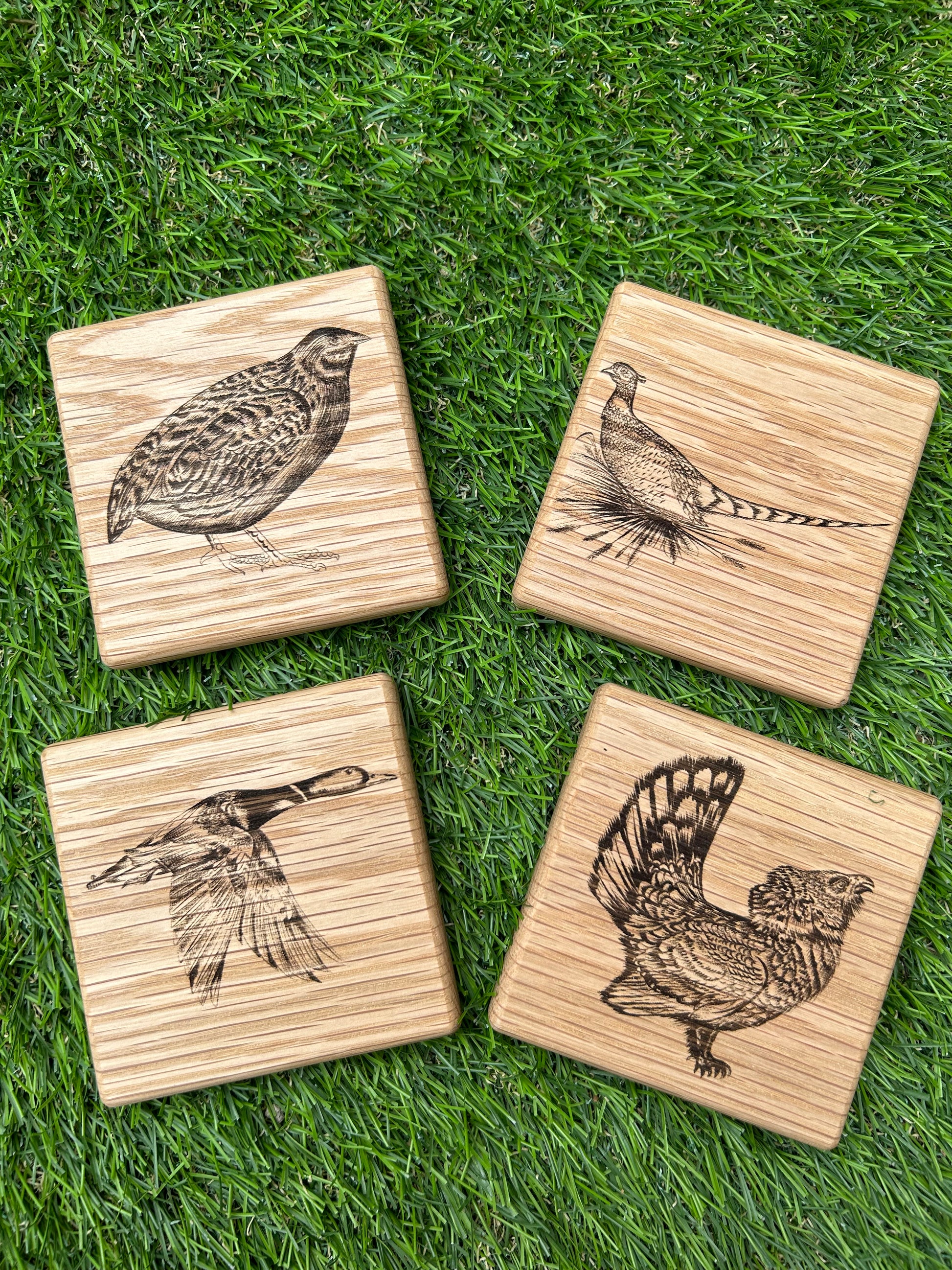 - Set of four solid Oak coasters.